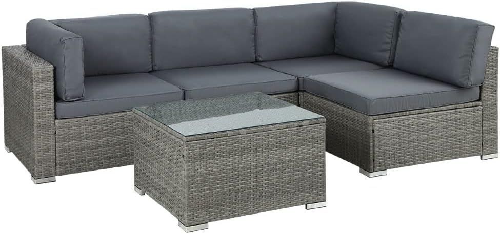 This outdoor sofa set includes two single sofas, two single armchairs, and a wide coffee table, offering ample space for everyone. Designed for flexibility, the wicker chair and table set is easy to assemble and configure according to your outdoor needs. Constructed with a powder-coated metal frame and thick cushions, the set is built to withstand outdoor conditions. The table features a tempered glass tabletop with a smooth surface for easy cleaning. Suitable for use both indoors and outdoors with its contemporary design.