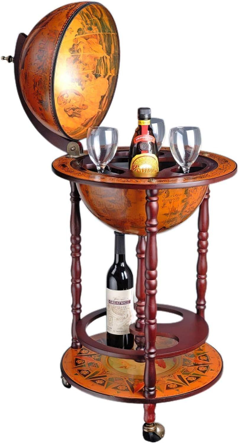 [Solid Construction] The frame of this wine rack is crafted from wood and plastic, enhancing its stability. The handmade surface provides a smooth texture. [Distinctive Design] Featuring an earth-shaped design, this wine cart adds a retro style. The map-painted exterior offers unique visual interest and conversation starters for wine tasting. [Easy Mobility] Equipped with roller design, this wine rack is simple to move, suitable for various locations like living rooms and dining rooms. [Wine Display] For enthusiasts, this cabinet offers a way to store wines safely, keeping them organised and accessible. [Assembly and Maintenance] This vintage wine trolley is simple to assemble with a few steps and no professional tools needed. It's also easy to clean, enhancing the wine tasting experience.