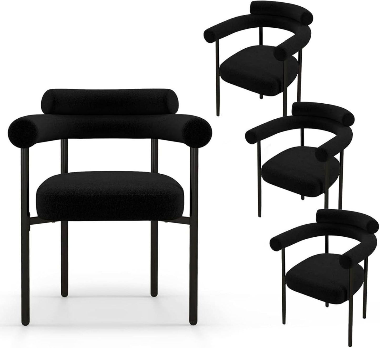 [Cushion Design] The kitchen chair features a round cushion filled with high-density sponge and a larger seat size of 19.7''x 19.7'' for a comfortable experience. [Curved Backrest] Designed with a curved backrest that aligns with ergonomic standards, providing support for your back and allowing your hands to rest. [Metal Frame] The dining chair includes padded black metal legs in a crisscrossed design, offering a sturdy structure with a capacity of up to 330 lbs. Its modern design suits various dining areas. [Foot Pad] The dining chair has rotatable foot pads, allowing for height adjustment and enhanced stability, preventing floor scratches and sliding. [Material] The seat and back are wrapped in teddy fleece fabric, offering a soft and skin-friendly surface. [Versatile Style] The chair's sleek lines fit various decor styles, making it suitable for dining rooms, kitchens, and other settings. It can be used for daily dining or as an accent piece in cafes, hotels, and restaurants. [Assembly] The chair is easy to assemble in about 10 minutes with included instructions. Comes in a set of 4.